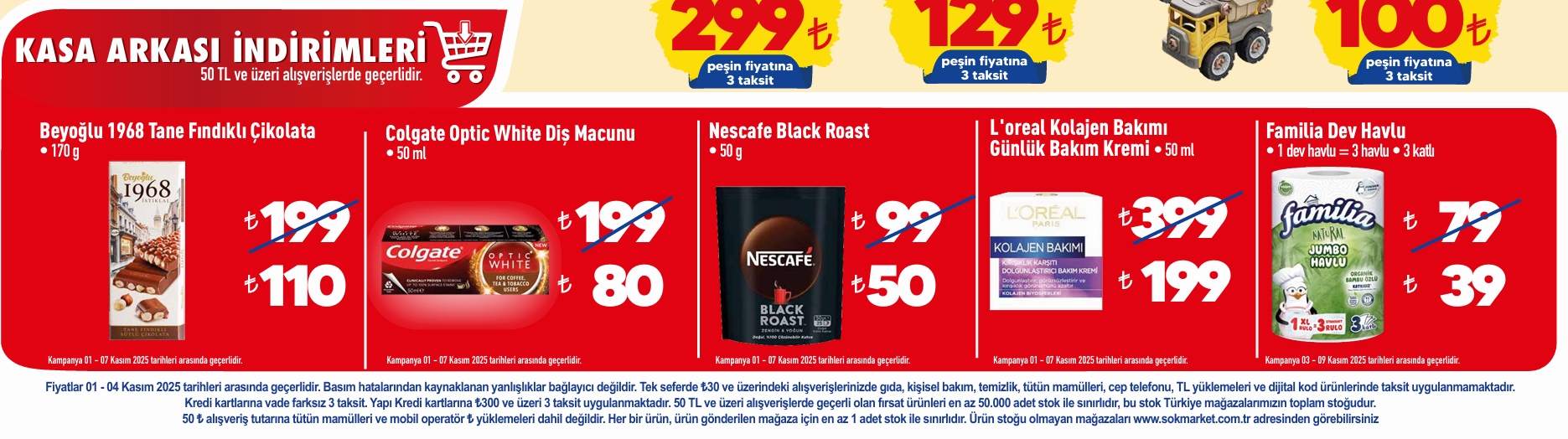 ŞOK FINDIKLI ÇİKOLATA - COLGATE DİŞ MACUNU - NESCAFE - GÜNLÜK BAKIM KREMİ - HAVLU