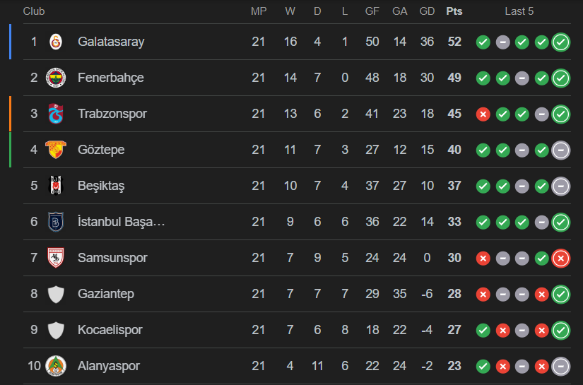 Galatasaray’ın hemen arkasında 49 puanla Fenerbahçe bulunuyor. Sarı-lacivertliler henüz mağlubiyet yaşamazken 14 galibiyet ve 7 beraberlik aldı. 48 gol atan Fenerbahçe 18 gol yedi ve +30 averaj yakaladı. Üçüncü sırada ise 45 puanlı Trabzonspor yer alıyor. Bordo-mavililer 13 galibiyet, 6 beraberlik ve 2 mağlubiyetle zirve yarışından kopmadığını gösteriyor.
