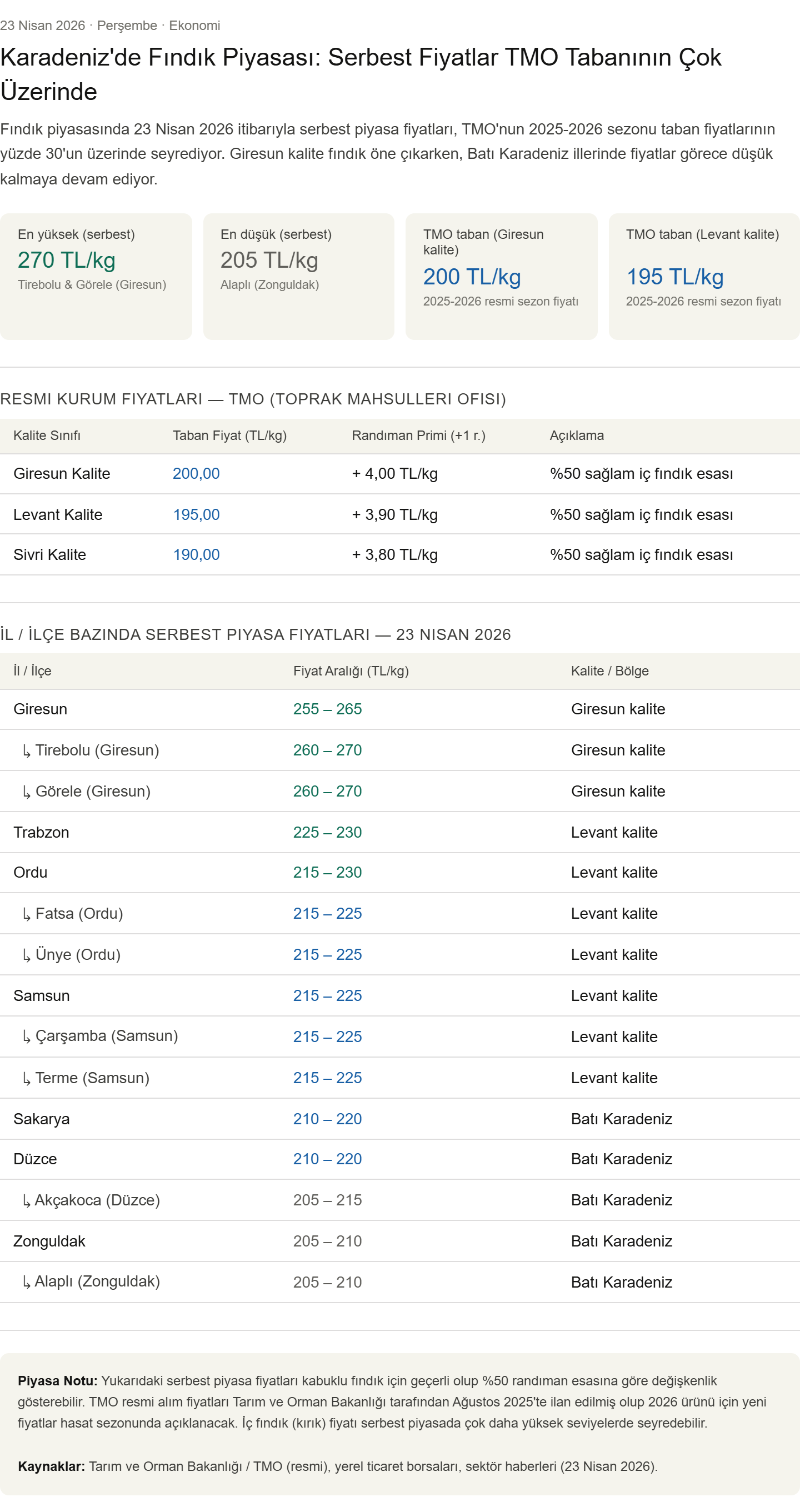 Resmi kurum (TMO) fiyatları: Toprak Mahsulleri Ofisi (TMO), 2025-2026 sezonu kabuklu fındık alım fiyatlarını %50 sağlam iç fındık esasına göre; Giresun kalite için kilogram başına 200 TL, Levant kalite için 195 TL, Sivri kalite için ise 190 TL olarak belirledi. Yüksek randımanlı fındığa ek prim de ödeniyor: Giresun kalitede her +1 randıman için 4 TL, Levant kalitede ise 3,90 TL ilave fiyat verilecek.