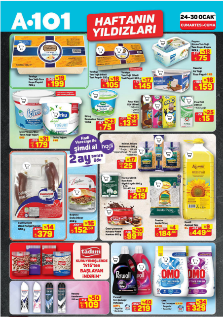 Türkiye genelinde binlerce mağazasıyla hizmet veren A101 24 – 30 Ocak 2026 tarihleri arasında geçerli olacak Haftanın Yıldızları kampanyasıyla dikkat çeken indirimler sunuyor. Temel gıda ürünlerinden temizlik ürünlerine, süt ve süt ürünlerinden atıştırmalıklara kadar birçok ürün bu hafta A101 raflarında avantajlı fiyatlarla tüketiciyle buluşuyor. Kampanya özellikle mutfak alışverişini ekonomik şekilde yapmak isteyenler için önemli fırsatlar barındırıyor.