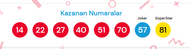 | Şanslı Sayılar | 14 - 22 - 27 - 40 - 51 - 70 | 57 | 81 |