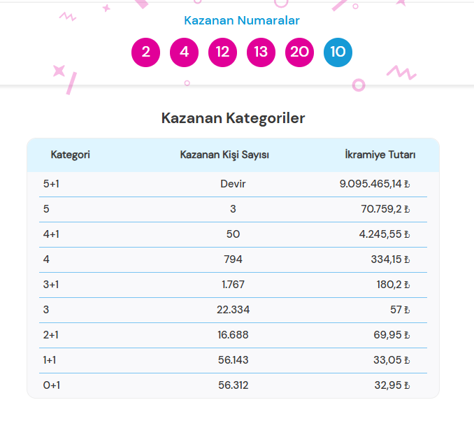 2, 4, 12, 13, 20 + Şans Topu: 10