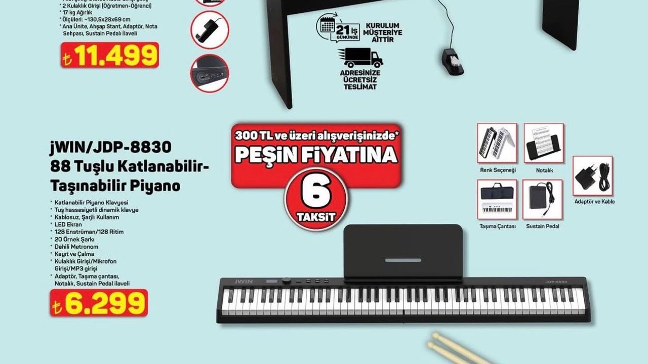 Türkiye genelinde uygun fiyatlı ürünleriyle dikkat çeken A101, 18 Şubat Çarşamba tarihli aktüel kataloğunda müzikseverleri sevindirecek ürünlere yer verdi. “Aldın Aldın” kampanyası kapsamında satışa sunulan dijital piyanolar ve ahşap davul seti, hem hobi amaçlı çalmak isteyenlere hem de profesyonel kullanım düşünenlere hitap ediyor. Üstelik kampanya kapsamında 300 TL ve üzeri alışverişlerde 6 taksit imkânı da sunuluyor.