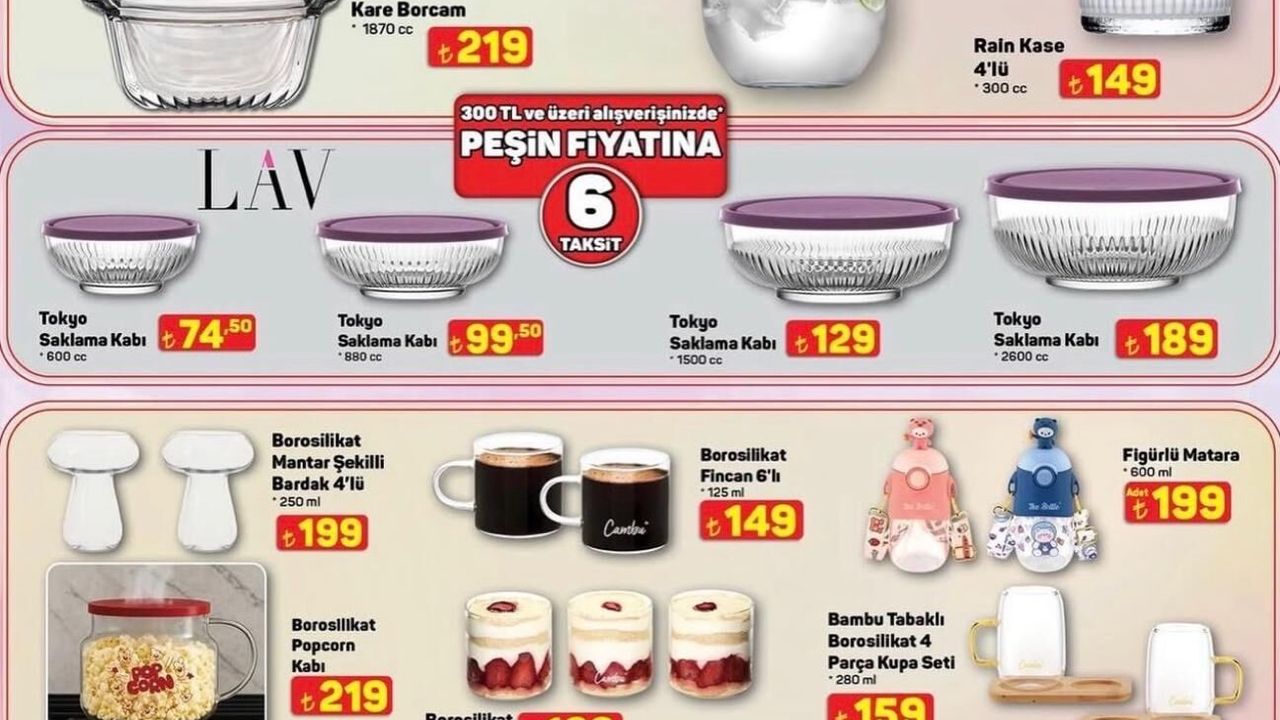 Dayanıklılığıyla bilinen borosilikat ürünler de kampanyada yer alıyor. Mantar Şekilli Bardak 4’lü set 199 TL, Borosilikat Fincan 6’lı set 149 TL, Borosilikat Kase 3’lü set 139 TL ve Popcorn Kabı ise 219 TL’den satışta. Bambulu tabaklı 4 Parça Kupa Seti 159 TL olurken, figürlü mataralar adet fiyatı 199 TL olarak açıklandı.