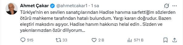 "Türkiye'nin en sevilen sanatçılarından Hadise Hanım'a sarf ettiğim sözlerden ötürü mahkeme tarafından hatalı bulundum. Yargı kararı doğrudur. Bazen eleştiri maksadını aşıyor."
