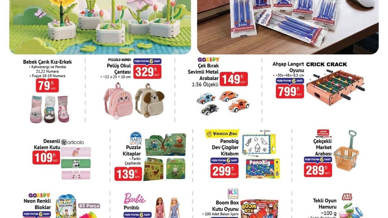 Bu haftanın en dikkat çeken ürünlerinden biri Dostoys Çiçek Bloklar oldu. Renkli ve eğlenceli tasarımıyla öne çıkan ürün 249 TL fiyat etiketiyle satışa sunuluyor. Çocukların el becerilerini geliştirmesine yardımcı olan Neon Renkli Bloklar ise 399 TL’den raflarda yerini alıyor.