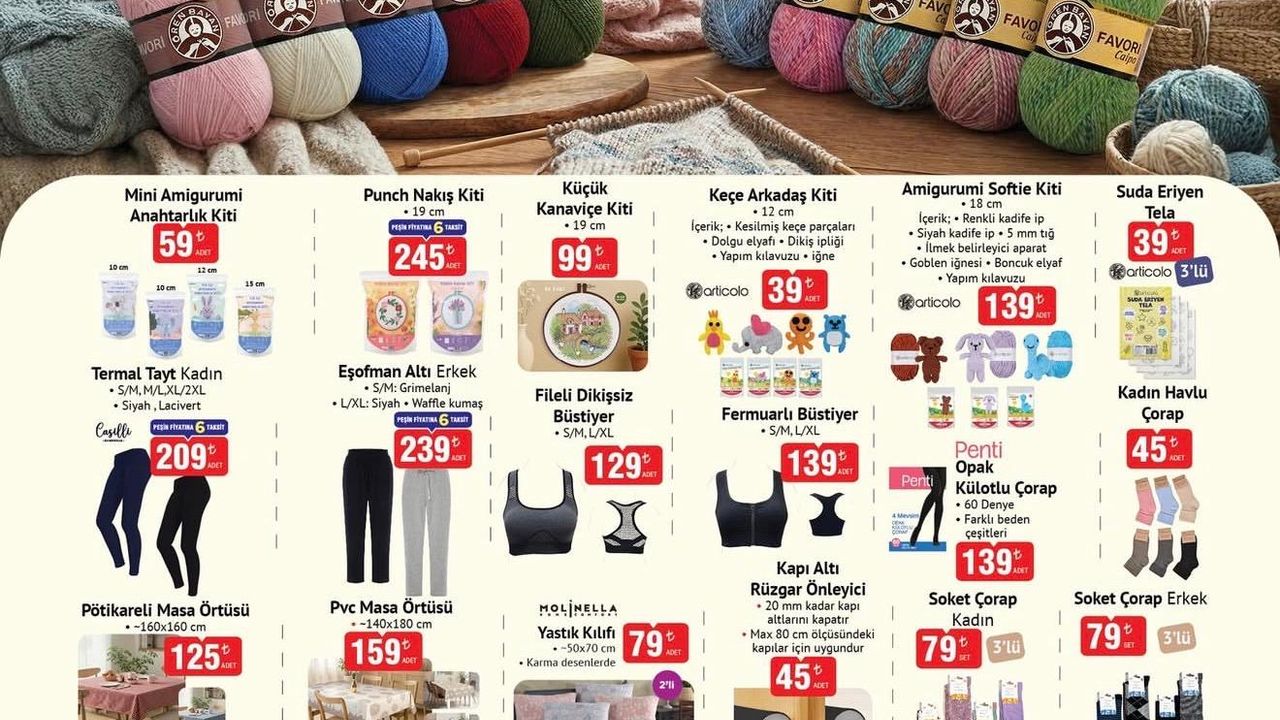 Bu haftanın en dikkat çeken ürünlerinden biri yumak çeşitleri oldu. Favori markalı farklı renklerde 3’lü yumak seti 99 TL’den satışa sunulacak. Caipo markalı 3’lü yumak seti ise 119 TL fiyat etiketiyle raflarda olacak.