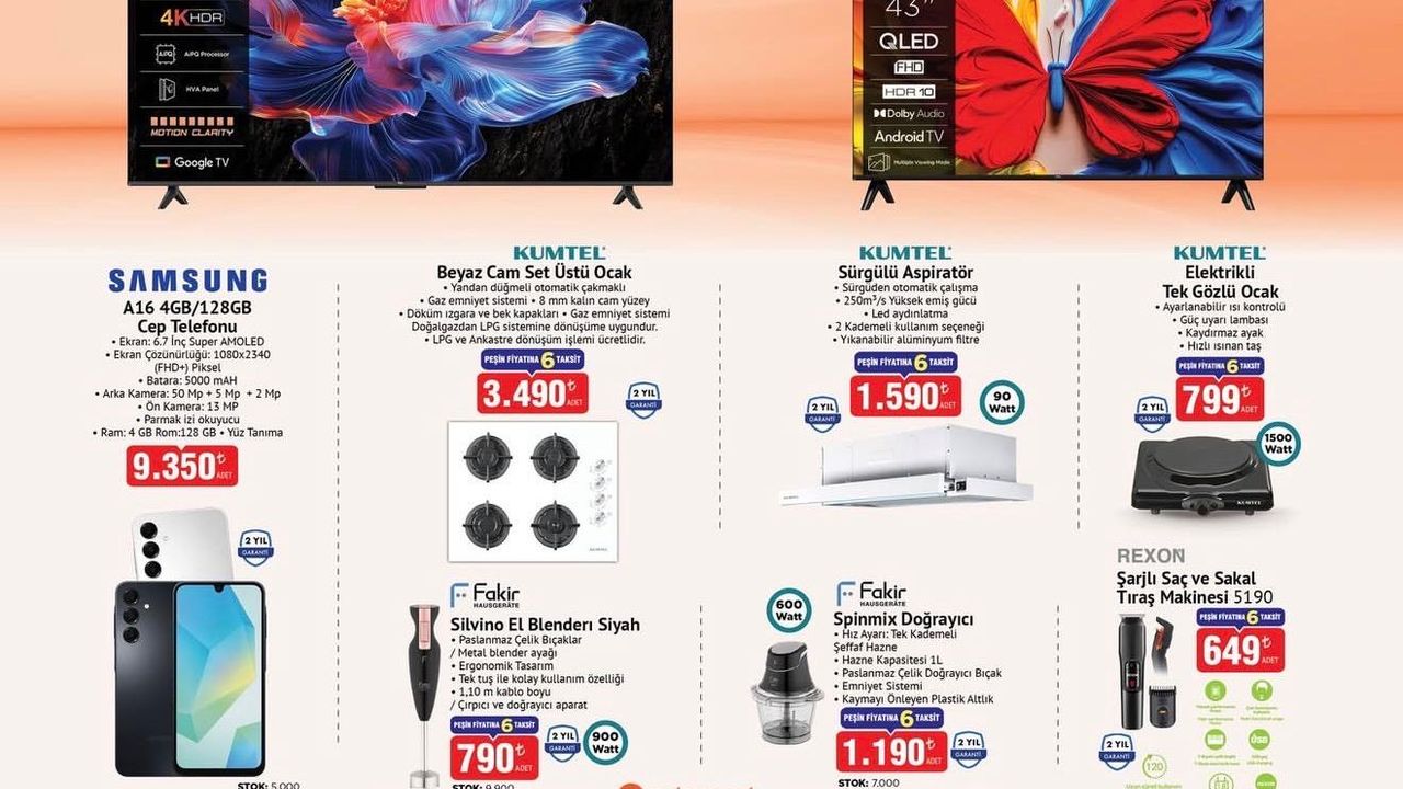 Kataloğun öne çıkan ürünü TCL marka 65 inç Ultra HD Google TV oldu. 65P6K model televizyon 32.990 TL fiyat etiketiyle satışa sunulacak. 4K HDR görüntü kalitesi, Google TV desteği ve ücretsiz kurulum avantajı bulunan ürün için 2 yıl garanti sunuluyor. Stok sayısının 5.000 adet ile sınırlı olduğu belirtiliyor. Büyük ekran televizyon almak isteyenler için dikkat çekici bir seçenek olarak öne çıkıyor.