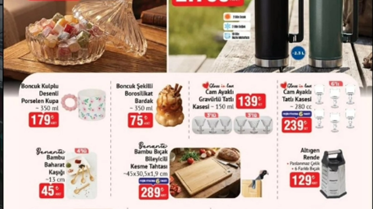 Sıcak ve soğuk içecekleri uzun süre muhafaza etmek isteyenler için klasik vakumlu çelik termos (1,8 L) 2.790 TL fiyatıyla satışa sunuluyor. Bunun yanında bambu ürünler de katalogda öne çıkıyor. Bambu baharatlık seti 45 TL, bambu bıçak seti ise 289 TL olarak tüketiciyle buluşuyor. Ayrıca mutfakta pratik kullanım sağlayan desenli badya (6 L) 45 TL’den satışta olacak.