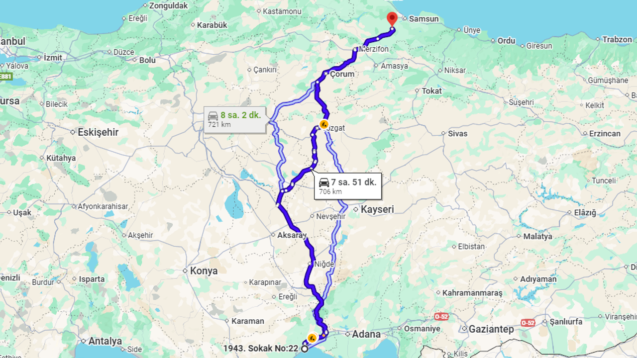 Samsun merkezden yola çıkarak bu tarihi ve lezzet dolu noktaya ulaşmak isteyenler için mesafe ve zaman verileri şu şekildedir: