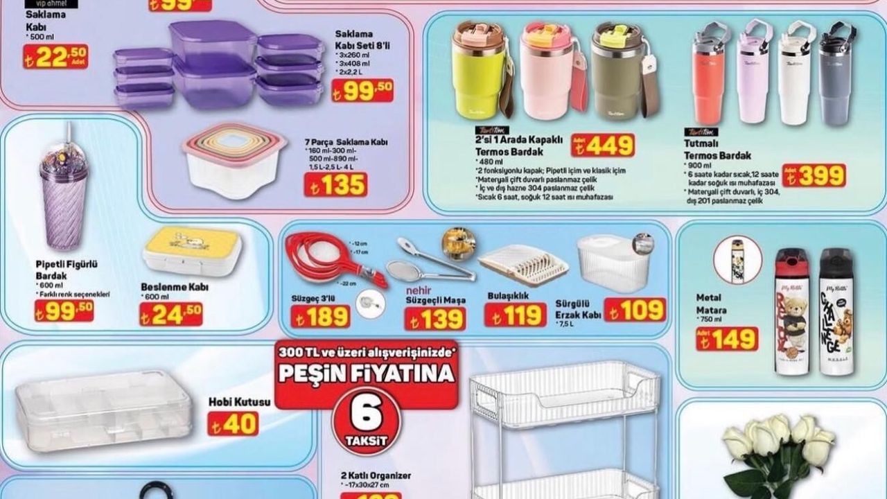 Bu haftanın dikkat çeken ürünlerinden biri 2’si 1 Arada Kapaklı Termos Bardak. 480 ml kapasiteli bu ürün 449 TL fiyatla geliyor. 900 ml Tutmalı Termos Bardak ise 399 TL’den satışta. 750 ml Metal Matara 149 TL, Pipetli Figürlü Bardak 99,50 TL ve Beslenme Kabı 24,50 TL olarak raflarda yer alıyor.