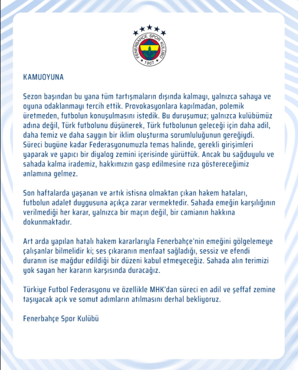 Fenerbahçe kamuoyuna yaptığı son duyuruda dikkat çeken ifadeler kullandı. Paylaşılan metinde sezon başından bu yana polemiklerden uzak kalmayı tercih ettiklerini vurgulayan sarı-lacivertli kulüp son haftalarda art arda yaşanan hakem hatalarına sert tepki gösterdi. Açıklamada futbolun sahada konuşulması gerektiği belirtilirken provokasyonlardan uzak bir duruş sergilediklerinin altı çizildi.