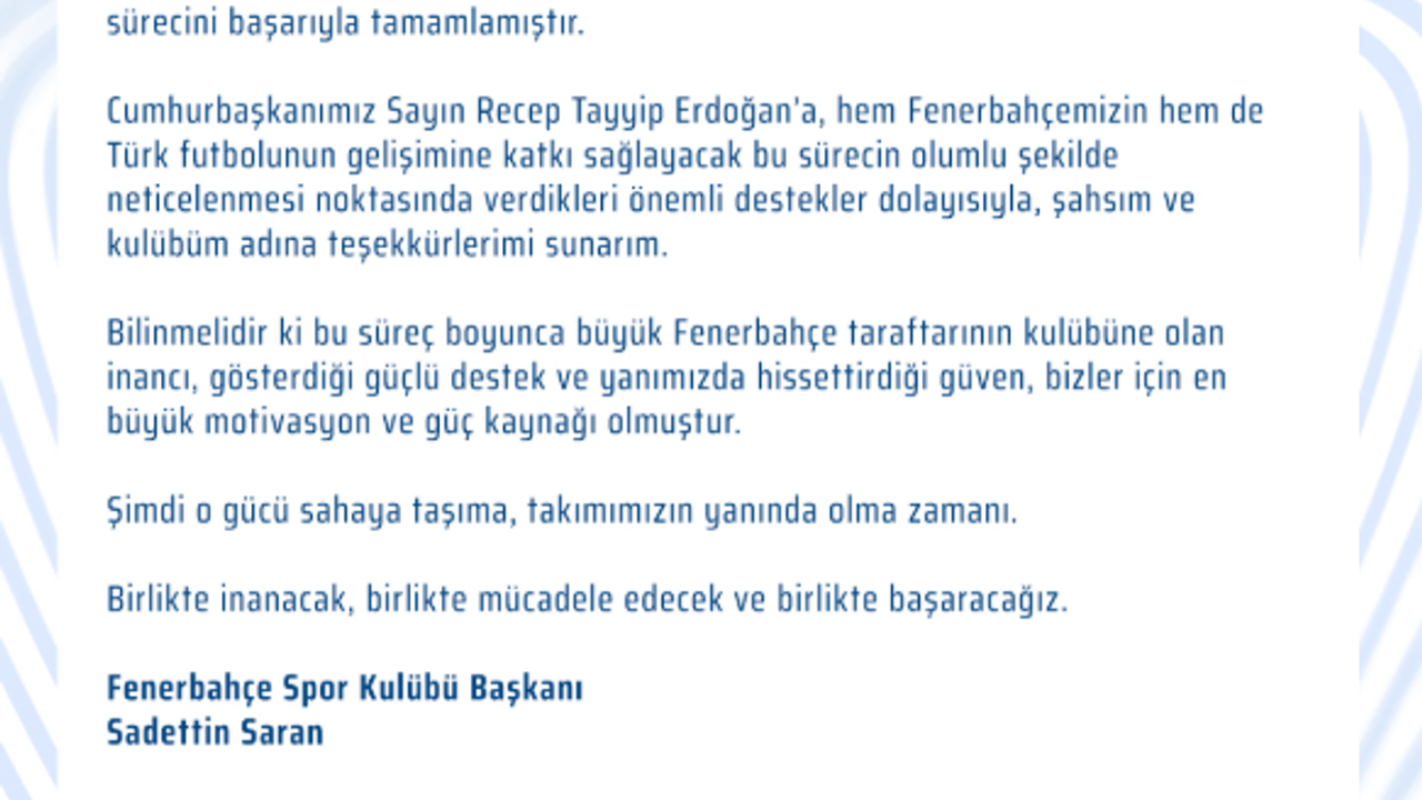 Görselde yer alan metinde Fenerbahçe Spor Kulübü Başkanı Sadettin Saran’ın imzası dikkat çekiyor. Saran, Cumhurbaşkanı Erdoğan’a hem Fenerbahçe’nin hem de Türk futbolunun gelişimine katkı sağlayacak bu önemli sürecin sağlıklı biçimde sonuçlanmasında verdiği desteklerden dolayı şahsı ve kulübü adına teşekkürlerini sundu. Bu ifadeler devlet-kulüp ilişkilerinin Türk futbolu adına taşıdığı önemi bir kez daha gözler önüne serdi.