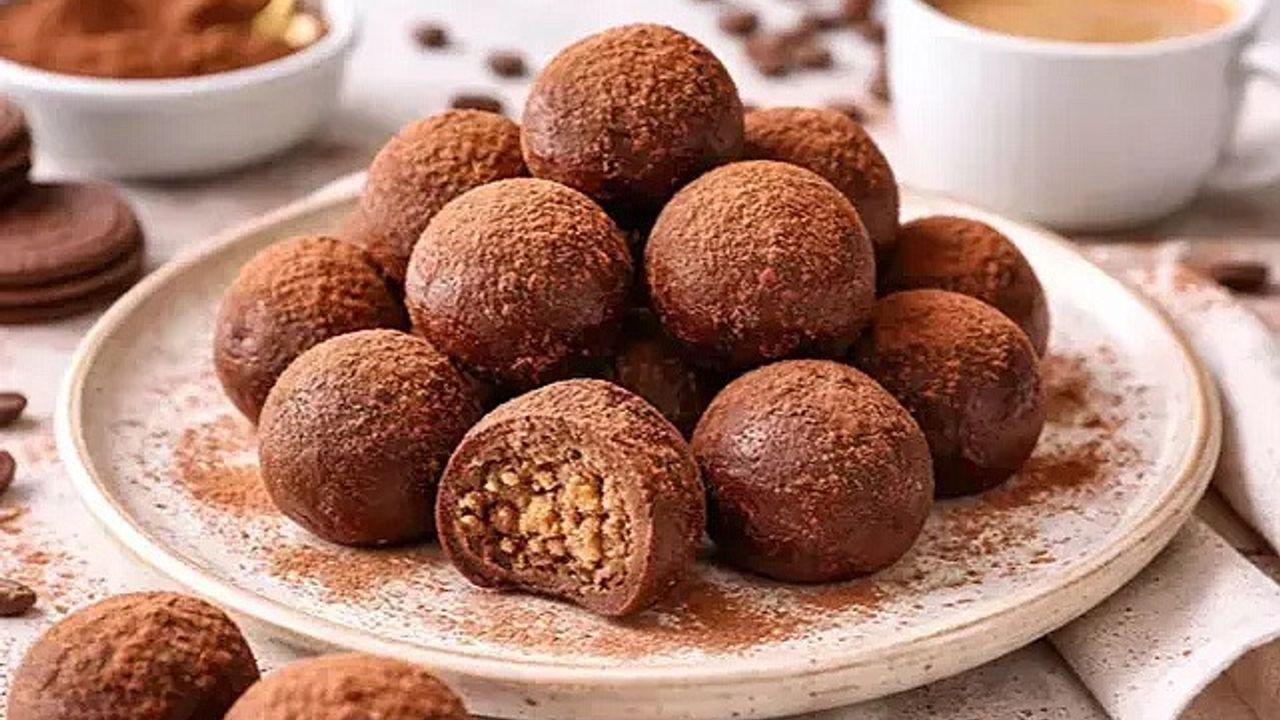 Karışımdan kaşık yardımıyla parçalar alın ve avuç içinde yuvarlayın. Topları servis tabağına dizin. Üzerine süzgeç yardımıyla kakao serpin. Daha yoğun aroma için ikinci bir kat kakao da eklenebilir.