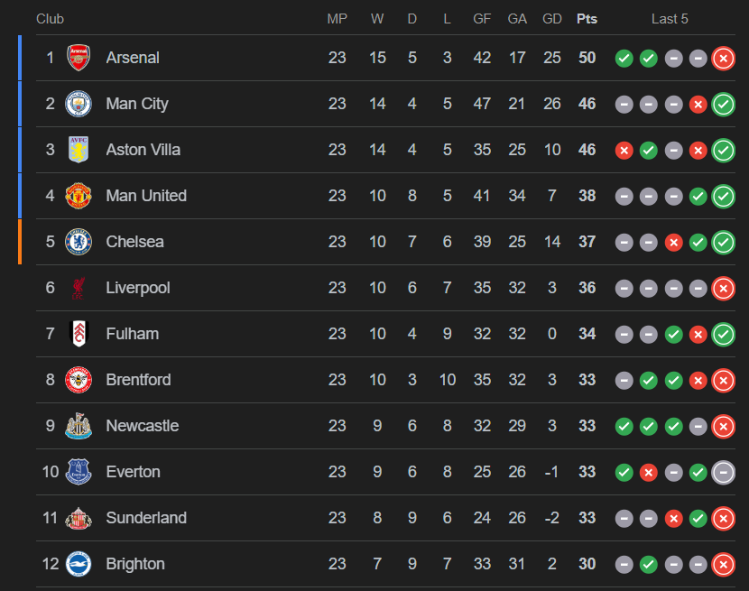 Avrupa futbolunun en güçlü ekiplerinden biri olarak gösterilen M. City bu sezon Premier Lig’de ortaya koyduğu performansla yine dikkatleri üzerine çekmeyi başardı. İngiliz temsilcisi ligde şu ana kadar çıktığı 23 karşılaşmada 14 galibiyet, 4 beraberlik ve 5 yenilgi alarak istikrarlı bir grafik çizdi. Topladığı 46 puanla zirve yarışının içinde yer alan Manchester City Premier Lig’de Arsenal’in ardından 2. sırada bulunuyor.