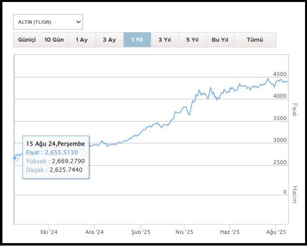 Tarihler 15 Ağustos 2024, Perşembe gününü gösterdiği zamanlarda gram altının fiyatı yaklaşık olarak 2,655 Türk lirasıydı. Yani neredeyse gram altın kendisini ikiye katladı. Bu durum yatırım yapmak isteyenlerin gerçekten atlamaması gereken bir durum. Yani altın bir senede yaklaşık 1745 Türk lirası kadar değerlendi. Bu durum gram altın için geçerli.