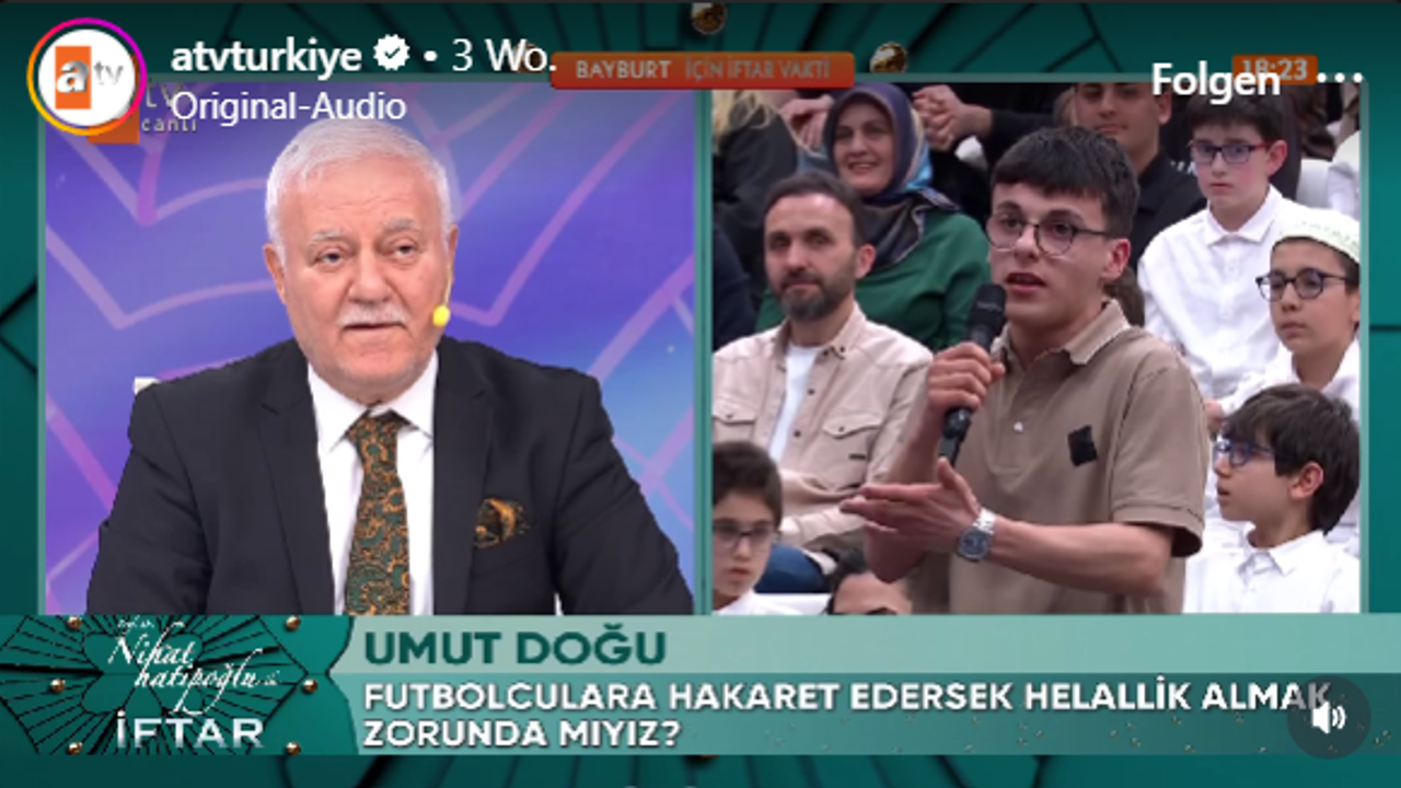 ATV ekranlarında yayınlanan Nihat Hatipoğlu programında, genç bir seyircinin yönelttiği soru gündeme damgasını vurdu. Seyirci “Futbolculara ettiğimiz küfürlerden sonra helallik almalı mıyız?” diyerek hem spor hem de etik konusunu tartışmaya açtı. Program izleyicilerden gelen sorularla sosyal medyada geniş yankı buldu.