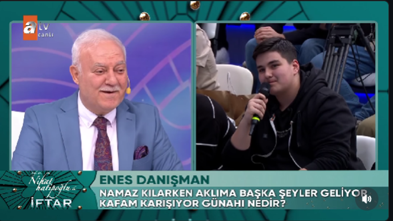Ramazan ayına girmemizle birlikte televizyon ekranlarında dini programlara olan ilgi artarken ATV ekranlarında yayınlanan Nihat Hatipoğlu programında izleyenleri hem gülümseten hem de rahatlatan bir diyalog yaşandı. Program sırasında söz alan genç bir izleyici namaz kılarken aklına farklı düşünceler geldiğini söyleyerek bu durumun günah olup olmadığını sordu.