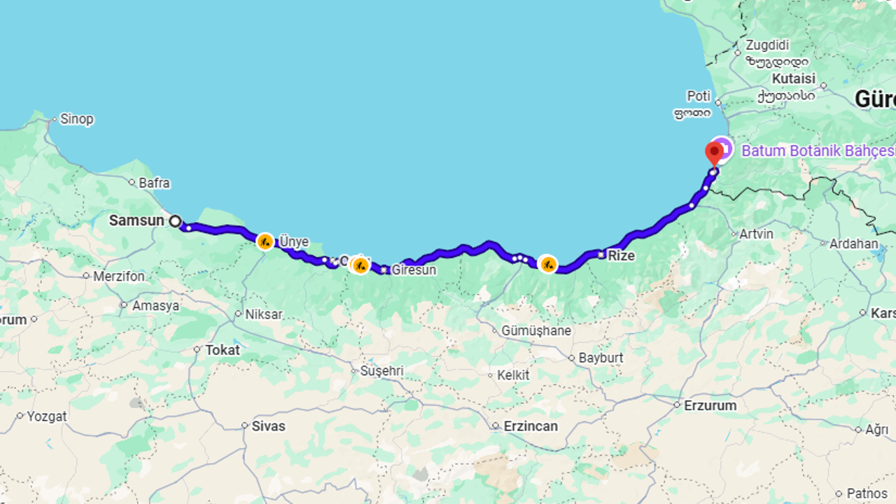 Orta Karadeniz'in en gelişmiş kenti Samsun'dan yola çıkarak komşu ülke Gürcistan'ın turizm merkezi Batum'a gitmek isteyenler için sahil şeridi boyunca uzanan keyifli bir rota bulunmaktadır.