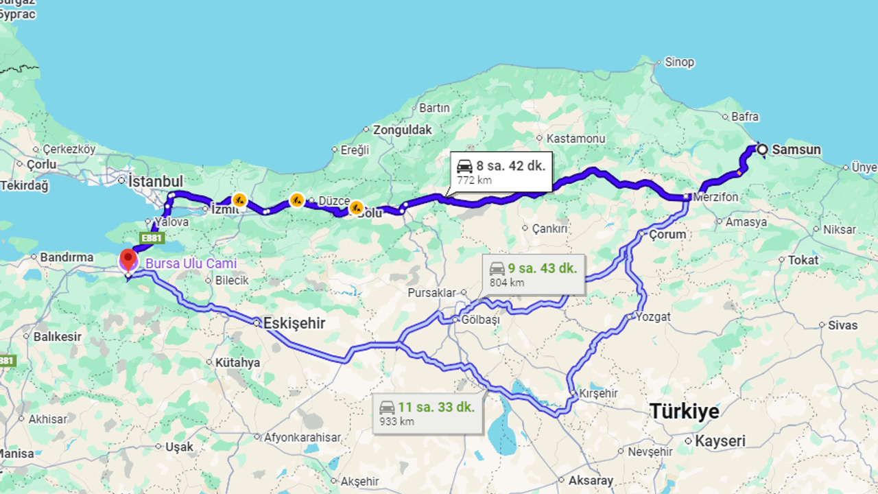 Samsun'dan yola çıkan bir sürücü, Marmara Bölgesi'ne ulaşmak için genellikle D-100 karayolunu veya Anadolu Otoyolu'nu tercih etmektedir. Samsun Bursa arası kaç kilometre sorusunun yanıtı olan bu uzun parkurda şu duraklar öne çıkmaktadır: