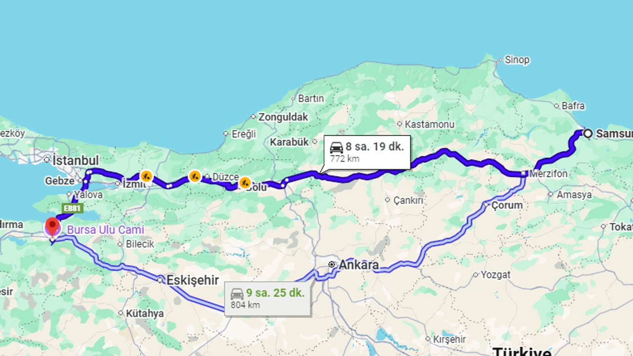 Kendi aracıyla yola çıkmayı planlayan sürücüler için samsun bursa arası kaç saat ve kaç kilometre bilgisi, yakıt planlaması açısından hayati önem taşımaktadır. Resmi ölçümlere göre karayolu üzerinden katedilen fiziksel mesafe şu şekildedir: