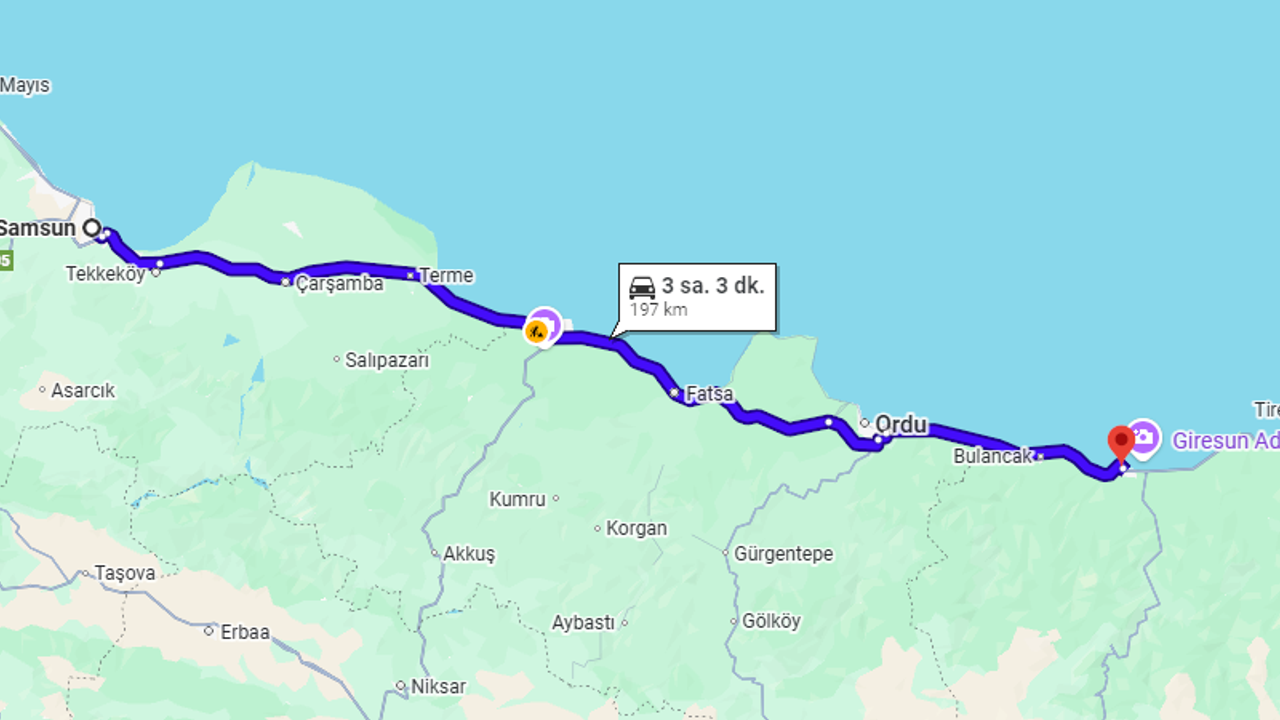 Samsun ile Giresun arasındaki coğrafi uzaklık, karayolu standartlarıyla oldukça kısa bir sürede aşılabilmektedir. Güncel ulaşım verilerine göre mesafe ve zaman parametreleri şu şekilde belirlenmiştir: