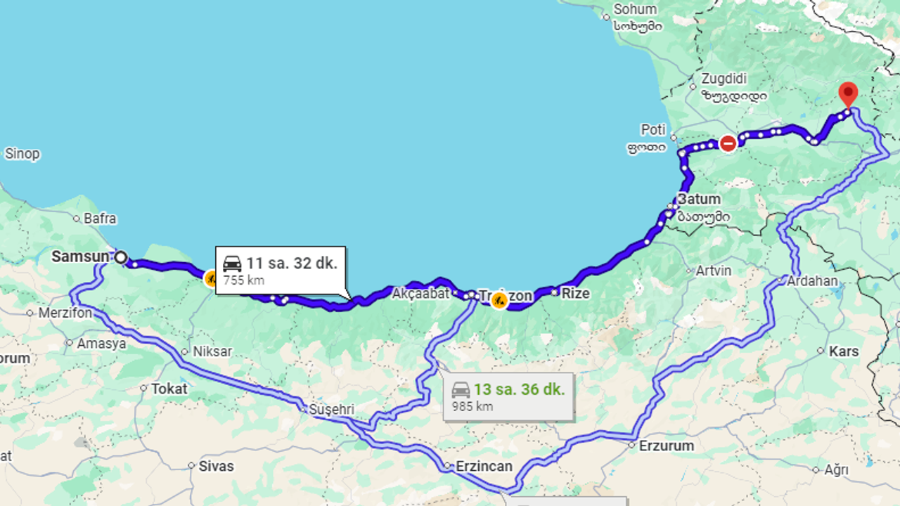 Samsun'dan hareket eden bir araç, Karadeniz sahil yolunu takip ederek sırasıyla Ordu, Giresun, Trabzon ve Rize illerini geride bırakmaktadır. Artvin iline bağlı Arhavi ve Hopa ilçelerini geçtikten sonra Türkiye'nin en işlek sınır noktalarından biri olan Sarp Sınır Kapısı'na ulaşılmaktadır.