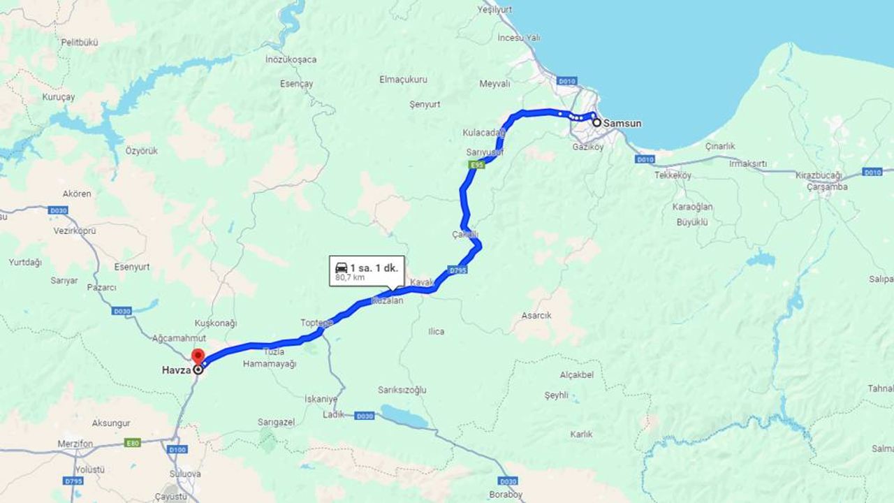 Hususi bir otomobil ile Samsun Havza arasındaki 84 kilometrelik yol, normal trafik koşulları altında yaklaşık 1 saat 15 dakika sürmektedir. Şehirler arası yolcu otobüsleri veya düzenli sefer yapan ilçe dolmuşları kullanıldığında ise yolcu indirme ve bindirme duraklamaları nedeniyle bu süre 1 saat 30 dakika ile 1 saat 45 dakika arasına çıkabilmektedir. Özellikle kış aylarında yaşanabilecek hava muhalefeti veya periyodik yol çalışmaları gibi durumların bu süreleri bir miktar uzatabileceği göz önünde bulundurulmalıdır.