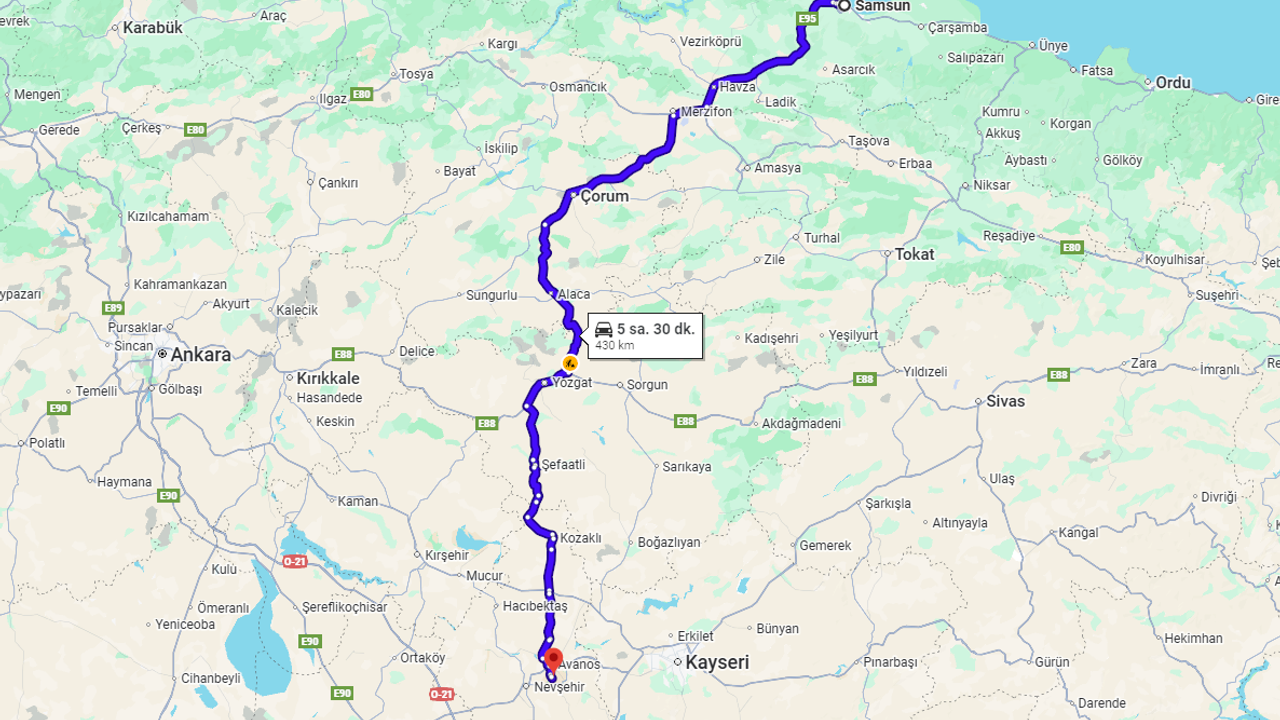 Samsun'dan yola çıkan bir yolcunun Kapadokya'ya varmak için takip edeceği en yaygın rota Samsun, Çorum, Yozgat ve Nevşehir hattıdır. Bu güzergah, yolların büyük bir bölümünün bölünmüş yol (duble yol) olması sayesinde sürüş güvenliğini ve konforunu artırmaktadır.