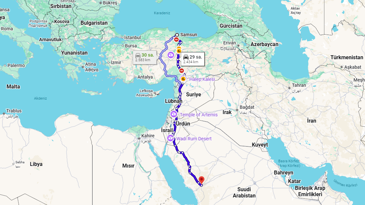 - Kuş Uçuşu Toplam Mesafe: Samsun ile Medine arasındaki doğrudan hava mesafesi yaklaşık 1886 ile 1888 kilometre civarındadır.