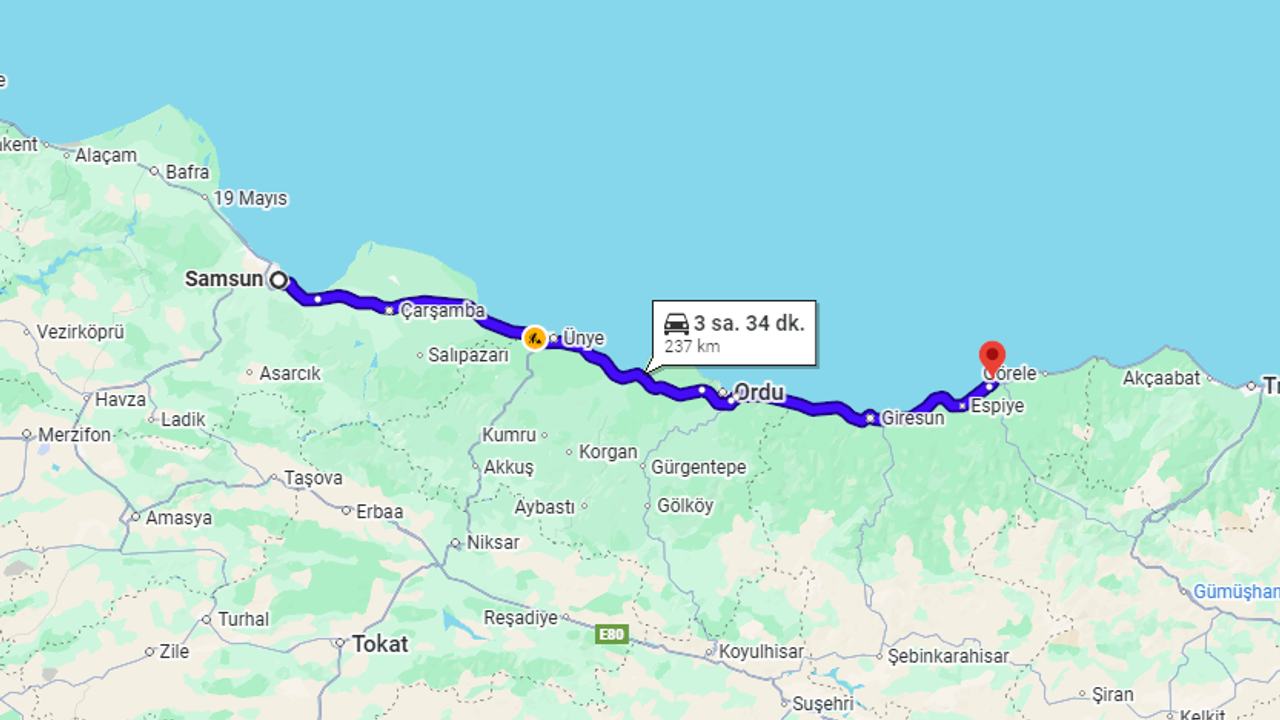 Samsun ile Tirebolu arasındaki fiziksel uzaklık, kullanılan navigasyon sistemlerine ve güncel yol çalışmalarına bağlı olarak şu şekilde ölçülmektedir: