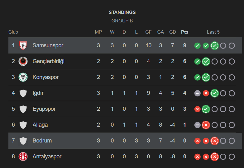 Grup sıralamasında Samsunspor’un ardından Gençlerbirliği ve Konyaspor 6’şar puanla üst sıralarda yer alıyor. Ancak her iki takımın da Samsunspor’a göre bir maç eksiği bulunmasına rağmen averaj ve oyun üstünlüğü kırmızı-beyazlılardan yana. Bodrum ve Antalyaspor’un henüz puanla tanışamaması ise grubun alt sıralarında ciddi bir fark oluştuğunu gösteriyor.
