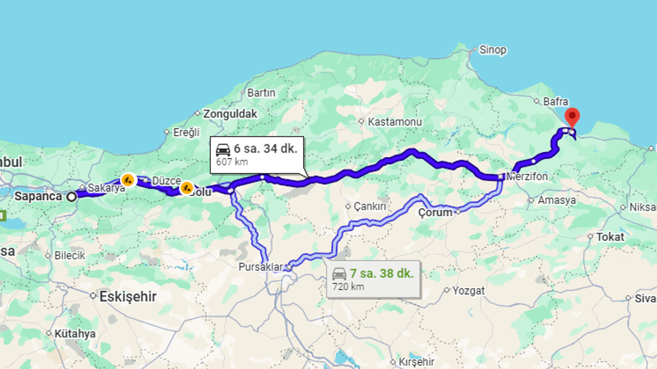 - En çok tercih edilen güzergah, Anadolu Otoyolu üzerinden Bolu ve Gerede hattını takip ederek Karadeniz Sahil Yolu'na bağlanan rotadır.