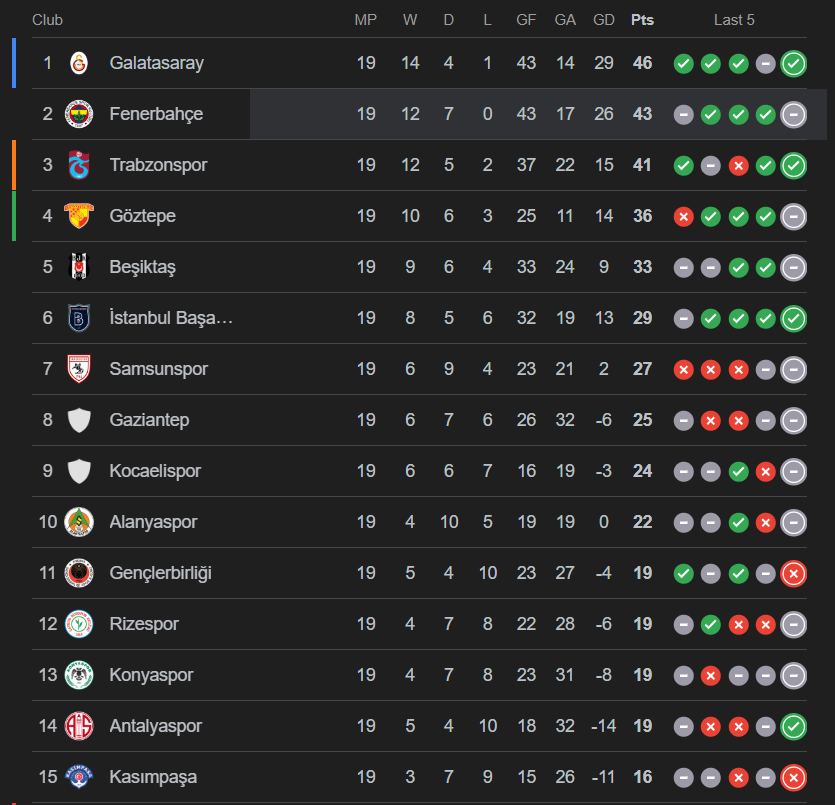 Bu sezon süper lig puan durumu geçmiş yıllara kıyasla çok daha dengeli bir tablo sunuyor. İlk üç sıradaki takımlar arasındaki puan farkının az olması ligin ilerleyen haftalarında sıralamanın sık sık değişebileceğini gösteriyor. Teknik direktörlerin kadro rotasyonları, sakatlıklar ve fikstür yoğunluğu da bu yarışta belirleyici faktörler arasında yer alıyor. Bu sezonun en büyük çekişmesi ise yine Galatasaray ve Fenerbahçe arasında... Galatasaray 46 puanla lider durumda Fenerbahçe ise 43 puanla onu 3 puan geriden takip ediyor.