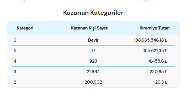 Çekiliş sonuçlarına göre şanslı rakamlar 21, 33, 43, 47, 55 ve 59 olarak belirlendi. En büyük kategoride kazanan olmaması, devreden tutarın devasa boyutlara ulaşmasına neden oldu. 188 milyon lirayı aşan bu miktar, şans oyunları tarihindeki önemli ikramiye seviyelerinden biri olarak dikkat çekiyor.
