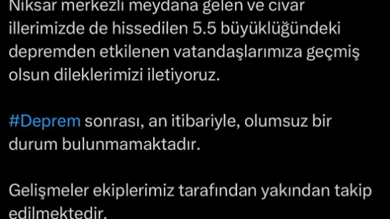 Açıklamanın özetinde ise deprem sonrası yapılan ilk değerlendirmelere göre şu ana kadar olumsuz bir durumun tespit edilmediği belirtildi. Tokat Valiliği ayrıca gelişmelerin ilgili ekipler tarafından yakından takip edildiğini ve gerekli tüm çalışmaların sürdürüldüğünü duyurdu. Paylaşımın sonunda ise afetlerden korunma temennisine yer verildi.