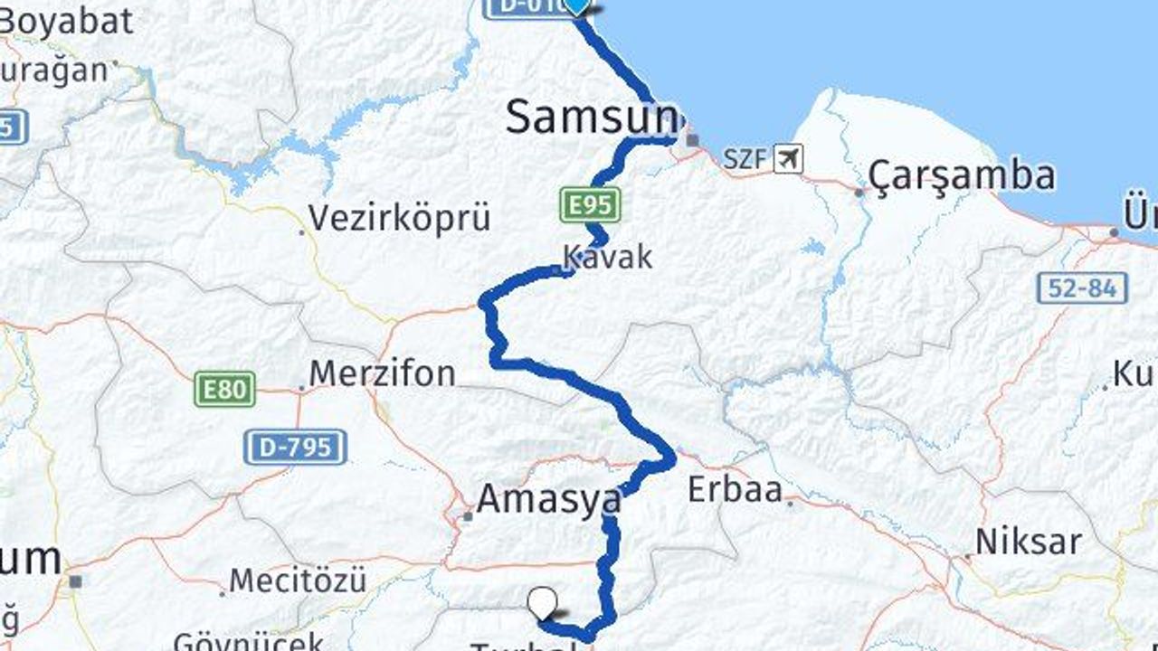 - Turhal ve Samsun arasındaki doğrusal kuş uçuşu uzaklık 107 kilometre olarak belirlenmiştir.