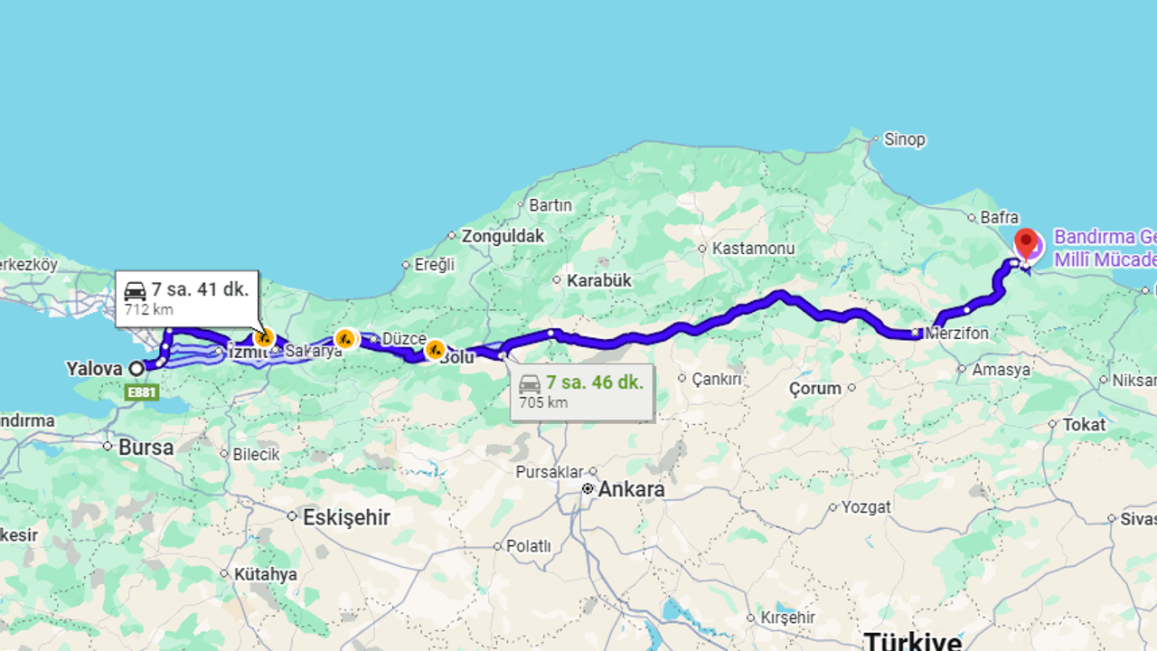 Resmi ölçümler ve navigasyon verileri ışığında Yalova ile Samsun arasındaki fiziksel uzaklık ve seyahat zamanlaması şu şekildedir: